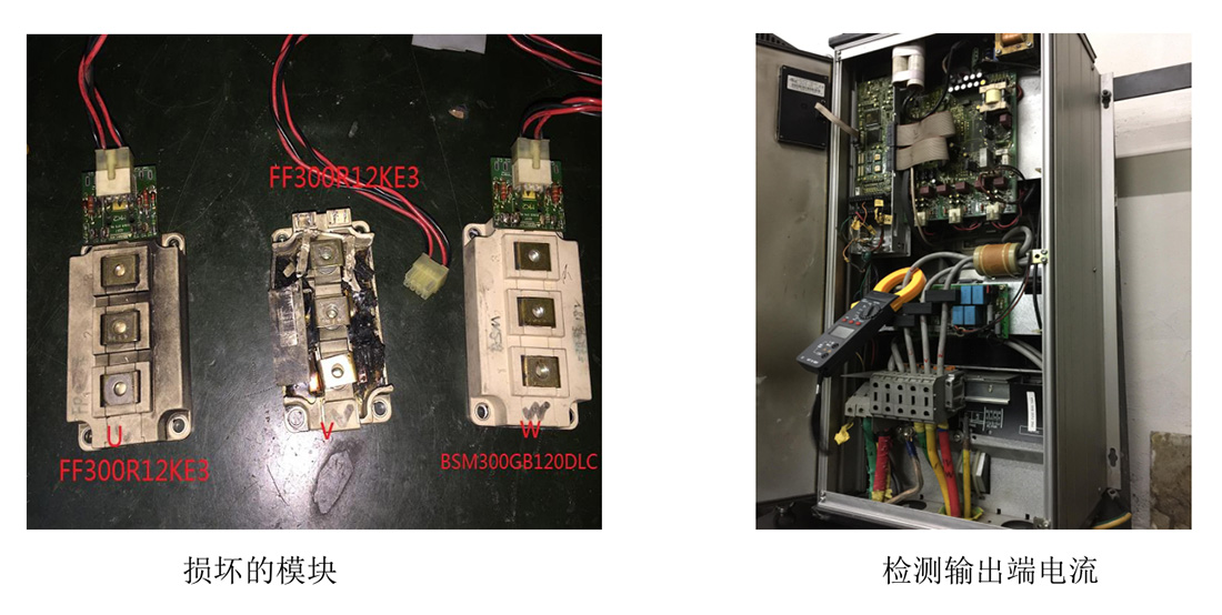 案例二:客戶反映故障報警“AL15”,為二次側(cè)電源故障,維修二次側(cè)電源電路。修好后現(xiàn)場裝機試機,檢測輸出側(cè)三相電源電壓平衡正常,輸出頻率45HZ時三相輸出電流為135A左右正常。連續(xù)運行3小時左右時變頻器發(fā)生故障停機,現(xiàn)場檢測電源驅(qū)動板未發(fā)現(xiàn)損壞,開關電源供電電路正常,驅(qū)動電路6路未發(fā)現(xiàn)短路、開路現(xiàn)象。V相IGBT模塊損壞(型號為 FF300R12KE3),U、W 正常。