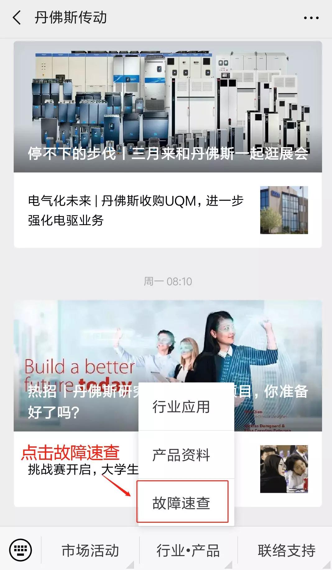 1.在丹佛斯傳動(dòng)公眾號(hào)菜單欄,點(diǎn)擊【行業(yè)·產(chǎn)品】,選擇“故障速查”,即可進(jìn)入故障速查首頁。