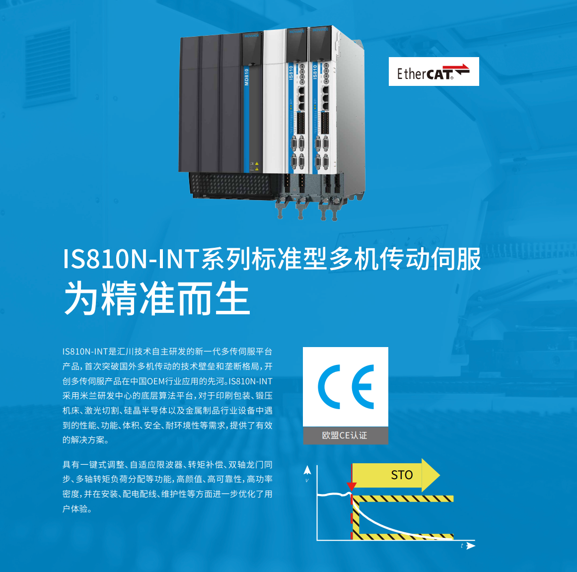 IS810是匯川技術自主研發多傳伺服平臺產品,突破國外多機傳動的技術壁壘和壟斷格局,打開多傳伺服產品在中國OEM行業應用的市場。IS810采用米蘭研發中心的底層算法平臺,對于印刷包裝、鍛壓機床、激光切割、硅晶半導體以及金屬制品行業設備中遇到的性能、功能、體積、安全、耐環境性等需求,提供了有效的解決方案。 具有一鍵式調整、自適應限波器、轉矩補償、雙軸龍門同步、多軸轉矩負荷分配等功能,高顏值、高可靠性,高功率密度,并在安裝、配電配線、維護性等方面進一步優化了用戶體驗。