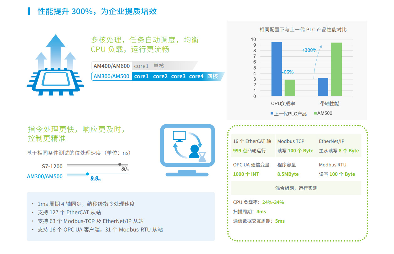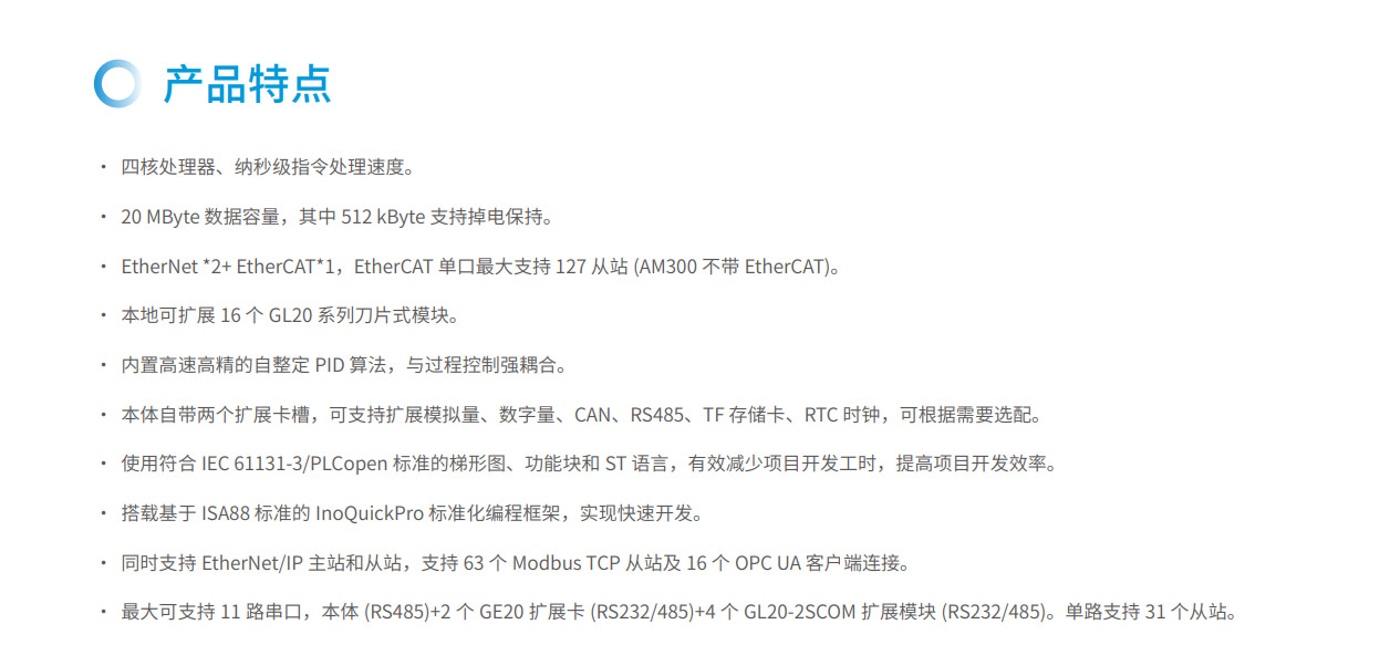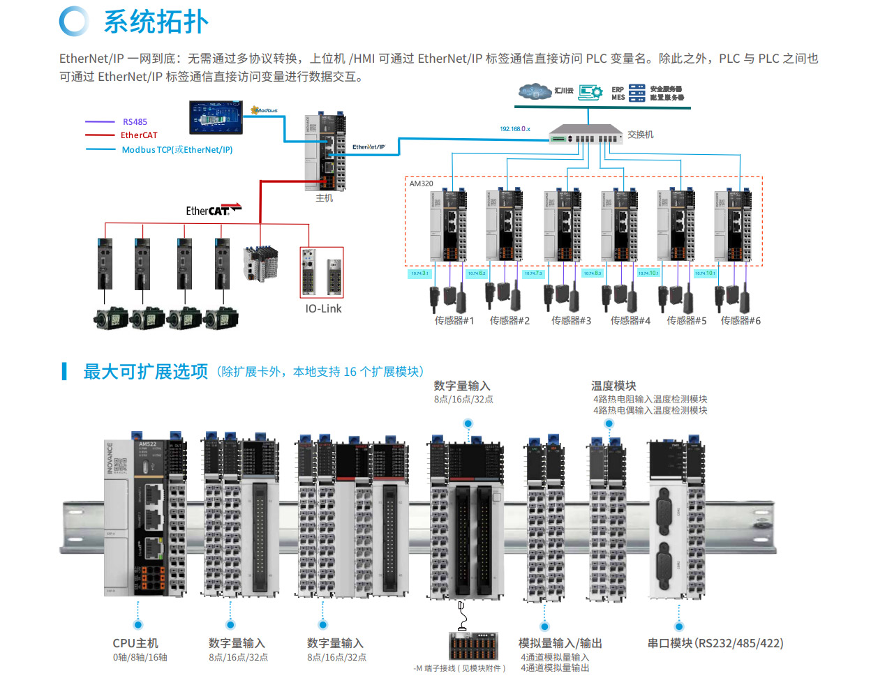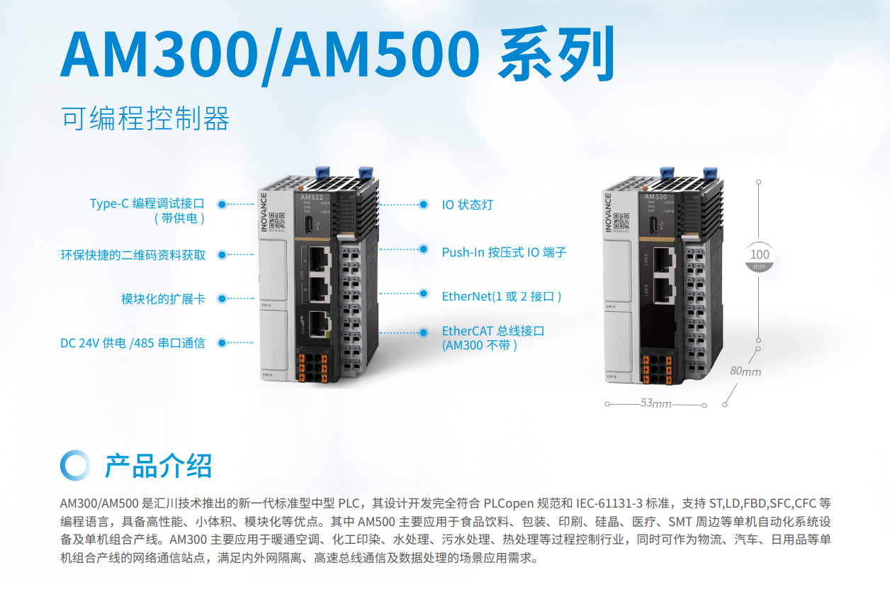 AM300系列是匯川技術(shù)推出的新一代中型PLC,其設(shè)計(jì)開發(fā)完全符合PLCopen規(guī)范和IEC-61131-3標(biāo)準(zhǔn),支持ST,LD,SFC,CFC等編程語言,具備高性能、小體積、模塊化等優(yōu)點(diǎn)。集成如EtherNet/IP、OPC UA、Modbus TCP(支持兩路不同網(wǎng)段的IP地址)、TCP/IP、RS485(最大可擴(kuò)展至3路)、CAN總線等全球標(biāo)準(zhǔn)工業(yè)網(wǎng)絡(luò)。主要應(yīng)用于暖通空調(diào)、化工印染、水處理、污水處理、熱處理等過程控制行業(yè),同時(shí)可作為物流、汽車、日用品等單機(jī)組合產(chǎn)線的網(wǎng)絡(luò)通信站點(diǎn),滿足內(nèi)外網(wǎng)隔離、高速總線通信及數(shù)據(jù)處理的場(chǎng)景應(yīng)用需求。其開發(fā)編程平臺(tái)InoProShop覆蓋從多軸復(fù)雜應(yīng)用、離散單機(jī)應(yīng)用到基本邏輯應(yīng)用,可搭載匯川技術(shù)基于ISA88標(biāo)準(zhǔn)開發(fā)的InoQuickPro標(biāo)準(zhǔn)化編程模板框架,實(shí)現(xiàn)規(guī)范的標(biāo)準(zhǔn)化管理開發(fā),降低人才培訓(xùn)成本。