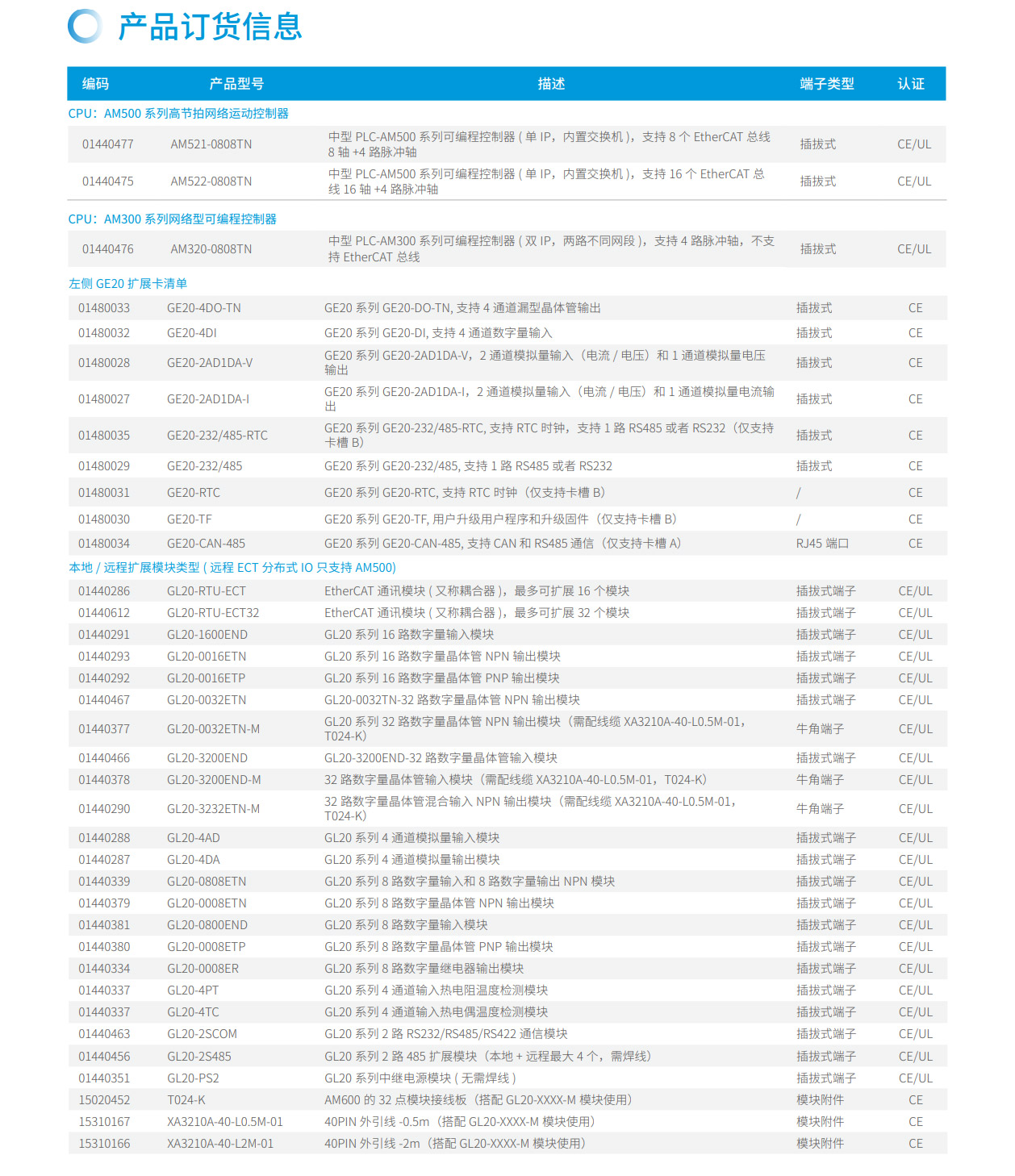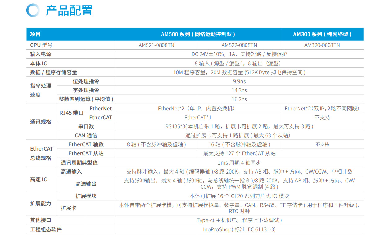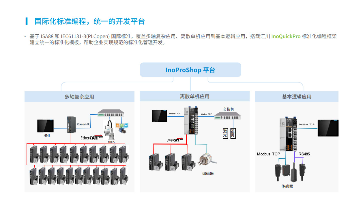 AM500系列是匯川技術(shù)推出的新一代標(biāo)準(zhǔn)型中型PLC,其設(shè)計(jì)開發(fā)完全符合PLCopen規(guī)范和IEC-61131-3標(biāo)準(zhǔn),支持ST,LD,SFC,CFC等編程語言,以其小巧的CPU體積、模塊化靈活組合及高節(jié)拍生產(chǎn)特性可適應(yīng)更多的應(yīng)用場(chǎng)景。支持EtherCAT、EtherNet/IP、OPC UA、Modbus TCP(支持兩路同一網(wǎng)段的IP地址)、TCP/IP、RS485(最大可擴(kuò)展至3路)、CAN總線等全球標(biāo)準(zhǔn)的工業(yè)網(wǎng)絡(luò)。主要應(yīng)用于食品飲料、包裝、印刷、硅晶、醫(yī)療、SMT周邊等單機(jī)自動(dòng)化設(shè)備及單機(jī)組合產(chǎn)線,滿足生產(chǎn)效率及控制精度提升場(chǎng)景需求。其開發(fā)編程平臺(tái)InoProShop覆蓋從多軸復(fù)雜應(yīng)用、離散單機(jī)應(yīng)用到基本邏輯應(yīng)用,可搭載匯川技術(shù)基于ISA88標(biāo)準(zhǔn)開發(fā)的InoQuickPro標(biāo)準(zhǔn)化編程模板框架,實(shí)現(xiàn)規(guī)范的標(biāo)準(zhǔn)化管理開發(fā),降低人才培訓(xùn)成本。