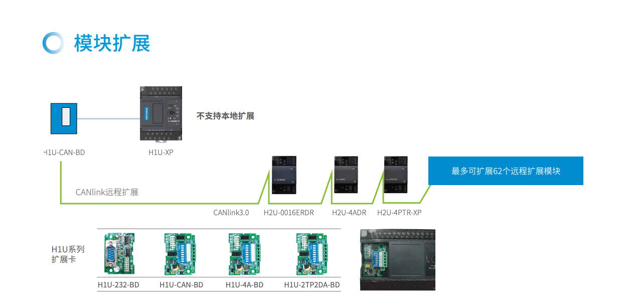 H1U系列PLC 隸屬匯川小型PLC 經濟型系列,其主要特點具備小體積,大程序容量,并具備3 軸高速100K 脈沖以便實現高精度定位。支持CANlink 擴展卡擴展H2u 系列的遠程擴展模塊來豐富IO。該系列PLC 點數覆蓋14~60 點。是小型自動化設備高性價比的選擇。
