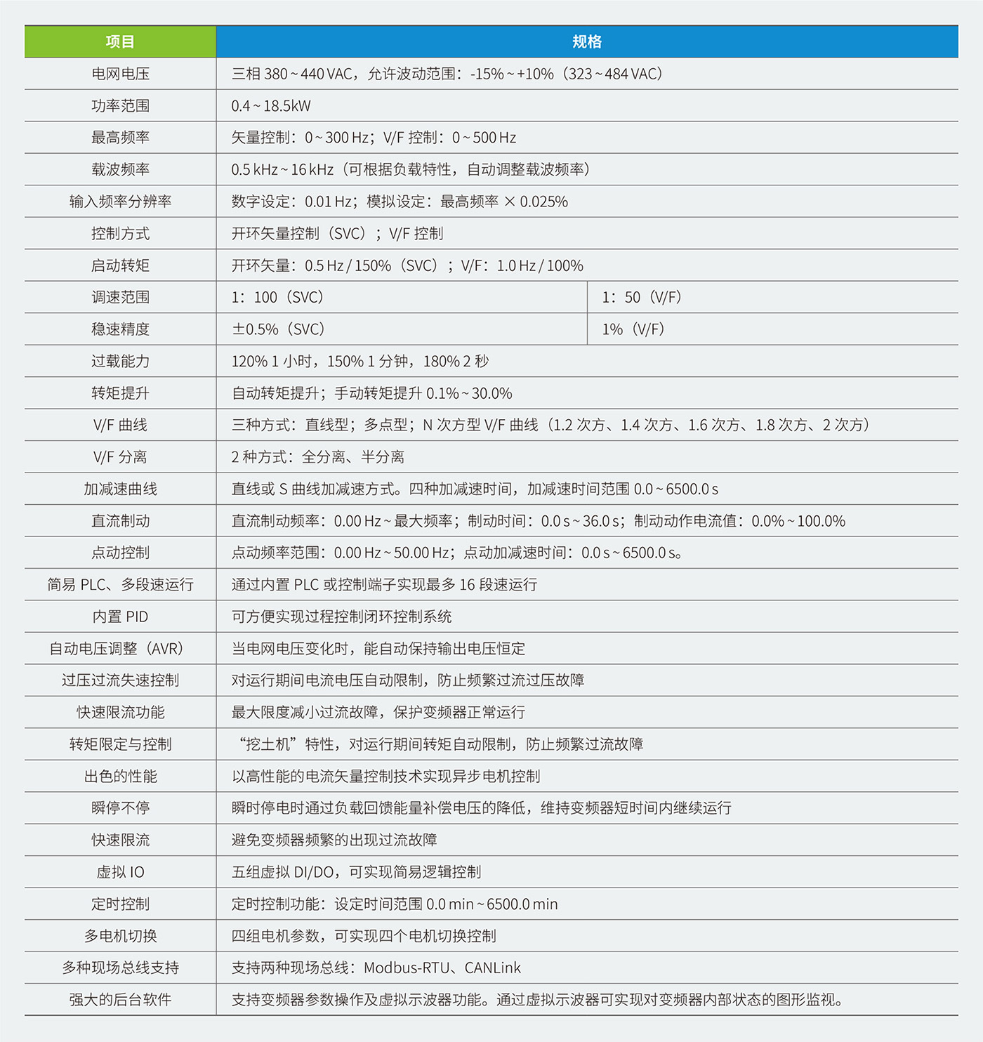 MD310系列變頻器是一款通用緊縮型多功能變頻器,采用開(kāi)環(huán)矢量和V/F 控制方式,以高性能的電流矢量控制技術(shù)可實(shí)現(xiàn)異步電機(jī)控制。MD310 標(biāo)配RS485 通訊接口,支持Modbus RTU 通訊,可擴(kuò)展I/O 擴(kuò)展卡、CAN 通信擴(kuò)展卡。內(nèi)置PID 可方便實(shí)現(xiàn)閉環(huán)過(guò)程控制系統(tǒng),最多可實(shí)現(xiàn)16 段速運(yùn)行。